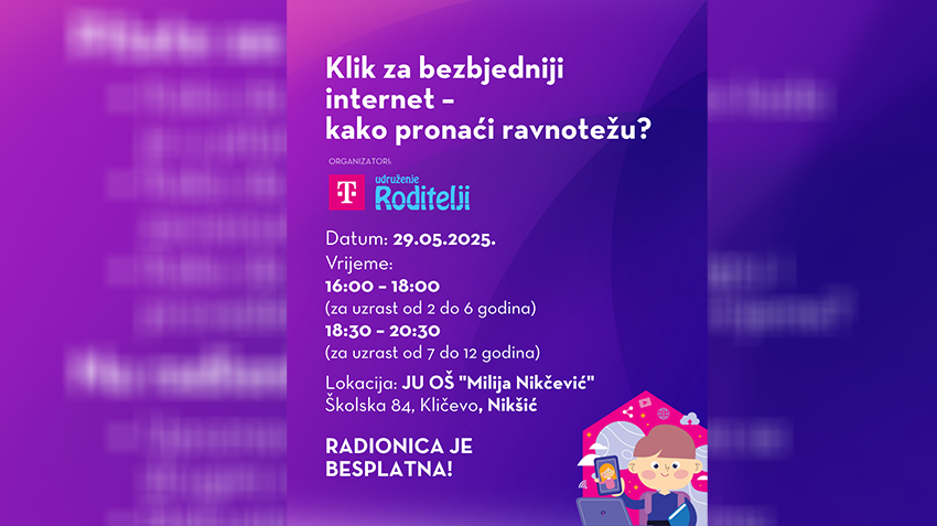 Udruženje Roditelji i Crnogorski Telekom nastavljaju seriju besplatnih interaktivnih radionica za roditelje djece uzrasta od 2 do 12 godina, na temu Klik za bezbjedniji internet – kako pronaći ravnotežu? Nakon Podgorice, druga radionica biće organizovana u Nikšiću, 29. maja 2025. godine u prostorijama OŠ „Milija Nikčević‟.