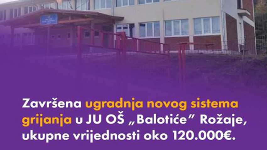 Završena je instalacija novog grijanja u OŠ ,,Balotiće“ u Rožajama čija je vrijednost radova oko 120.000 eura. Učenici ove škole su se u prethodnom vremenu grijali uz pomoć peći na čvrsta goriva. Novi sistem grijanja je radijatorskog tipa, sa centralnom kotlarnicom, saopšteno je iz Ministarstva prosvjete, nauke i inovacija.