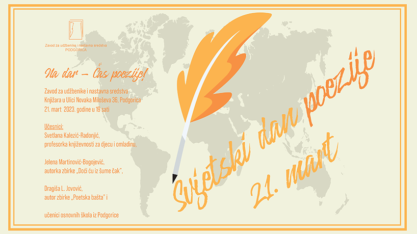 Zavoda za udžbenike i nastavna sredstva Podgorica organizuje 21. marta u svojoj knjižari u Ulici Novaka Miloševa br. 36 u 19 sati poetsko veče Na dar – Čas poezije!, povodom Svjetskog dana poezije. Zavod za udžbenike se tako pridružuje brojnim institucijama širom svijeta koje obilježavaju Svjetski dan poezije, 21. mart. U programu će učestvovati Svetlana […]