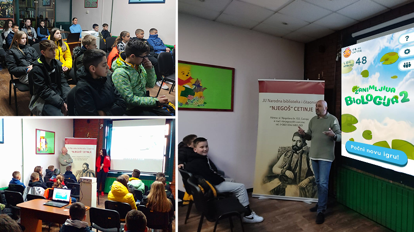 Profesor biologije u Gimnaziji Cetinje Petar Špadijer predstavio je učenicima VI, VII i VIII razreda osnovnih škola „Njegoš“ i „Lovćenski partizanski odred“ interaktivne igrice „Zanimljiva biologija 2“. Riječ je o izuzetnom alatu koji na zanimljiv  način vodi  đake kroz svijet biljaka, životinja i gljiva. Igrica je primarno namijenjena učenicima II razreda gimnazije, ali je, uz malu pomoć nastavnika, korisna i za učenike osnovnih škola, a profesor Špadijer je autor pitanja.