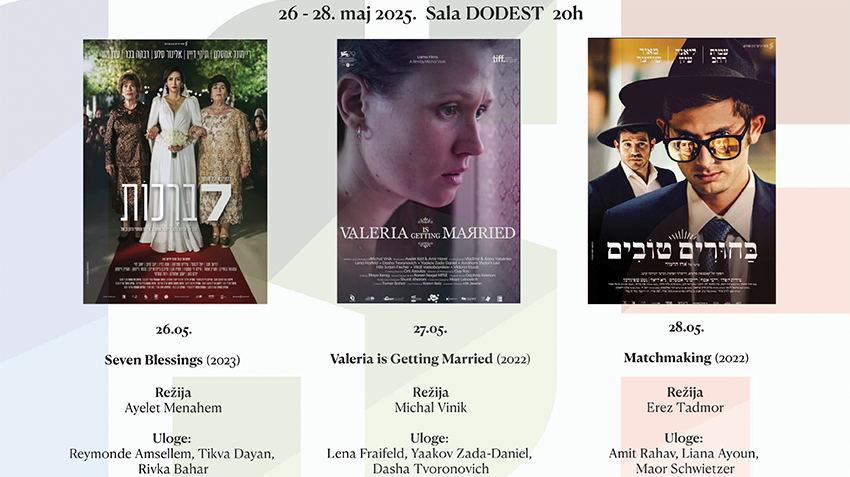 Ambasada Izraela u Beogradu u partnerstvu sa KIC-a „Budo Tomović‟ organizuje Dane izraelskog filma od 26. do 28. maja. Revija će obuhvatiti niz pažljivo odabranih filmova koji donose presjek savremene izraelske kinematografije. Riječ je o filmovima kroz koje je oslikano bogatstvo izraelskog društva, raznolikost, izazovi, ali i univerzalne teme, sa fokusom na teme ljubavi, braka i porodičnih odnosa.