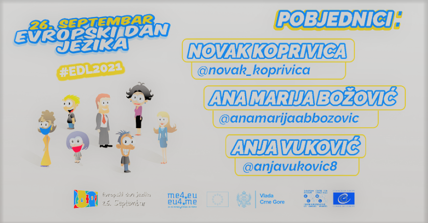 Novak Koprivica, Ana Marija Božović i Anja Vuković pobjednici su ovogodišnje nagradne igre koju je Generalni sekretarijat Vlade organizovao povodom obilježavanja Evropskog dana jezika, 26. septembra. Njima će biti uručene vrijedne nagrade koje će ih podstaći na nastavak učenja nekog od evropskih jezika, saopšteno je iz Generalnog sekretarijata.