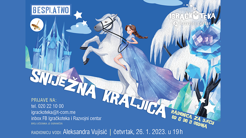 U organizaciji Igračkoteke i Razvojnog centra Podgorica udruženja Roditelji, u četvrtak, 26. januara, u 19 sati, biće održana radionica „Sniježna kraljica“ koja je namijenjena djeci od šest do osam godina. Ovu edukativna aktivnost dio je nezavisnog projekta Čigralište, a vodiće je profesorica engleskog jezika i književnosti Aleksandra Vujisić.