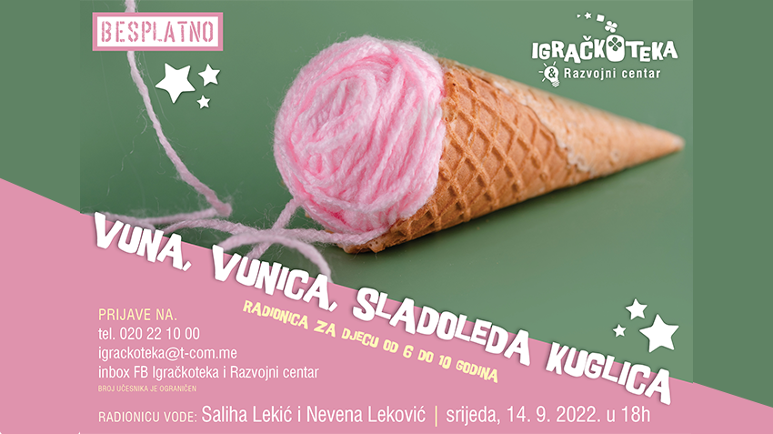 Kako su saopštili, u srijedu, 14. septembra u 18 sati, biće održana kreativna radionica pod nazivom „Vuna, vunica, sladoleda kuglica“, koja je namijenjena djeci od šest do 10 godina.
