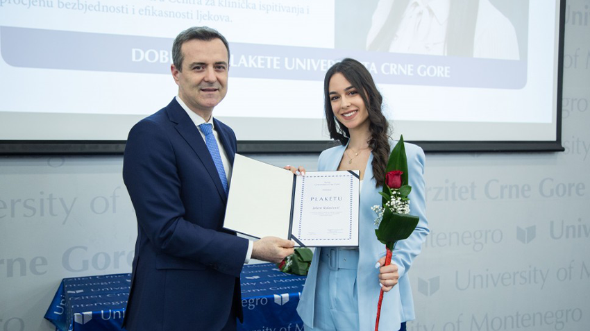 Studentkinja Medicinskog fakulteta, studijskog programa Farmacija, Jelena Rakočević sa prosjekom 9.95 zavrijedila je Plaketu za završene studije sa najboljim uspjehom za oblast tehničkih, prirodno-matematičkih i medicinskih nauka Univerziteta Crne Gore (UCG).