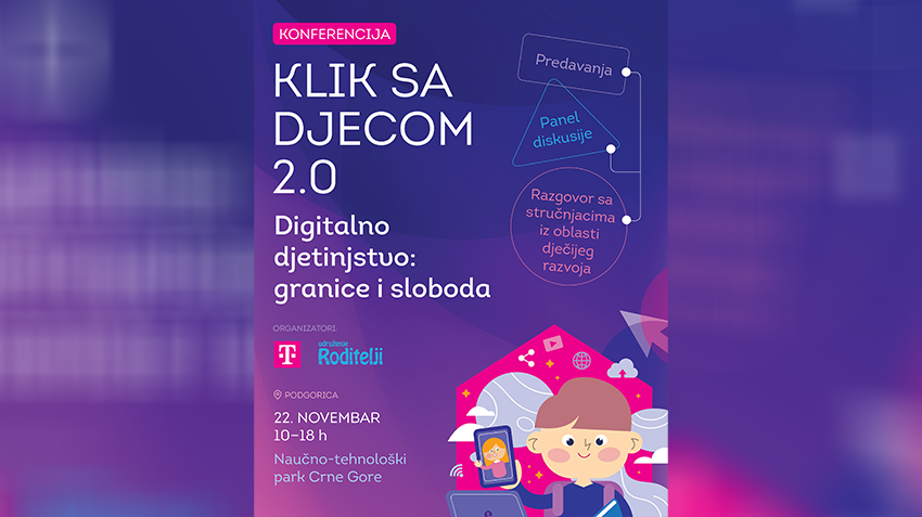 Drugo izdanje najveće konferencije posvećene roditeljstvu u Crnoj Gori „Klik sa djecom 2.0“, biće održano u subotu, 22. novembra, u Naučno-tehnološkom parku Crne Gore na temu „Digitalno djetinjstvo: granice i sloboda“. Organizatori ovog skupa su Crnogorski Telekom i Udruženje Roditelji.