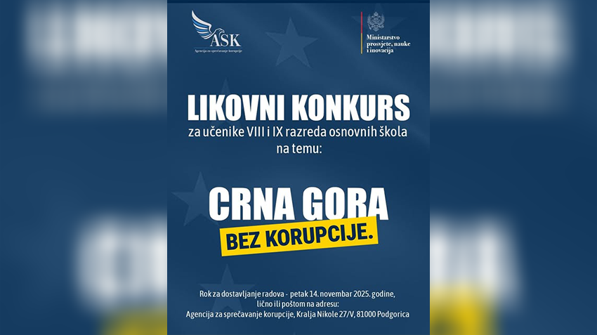 Agencija za sprečavanje korupcije (ASK) i Ministarstvo prosvjete, nauke i inovacija Crne Gore organizuju povodom 9. decembra, Međunarodnog dana borbe protiv korupcije likovni konkurs za učenike VIII i IX razreda osnovnih škola.