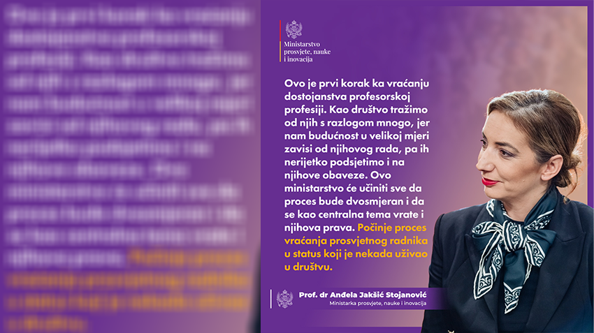 „Ovo Ministarstvo će učiniti sve da proces bude dvosmjeran i da se kao centralna tema vrate i nihova prava. Počinje proces vraćanja prosvjetnog radnika u status koji je nekada uživao u društvu“, naglasila je Jakšić-Stojanović.