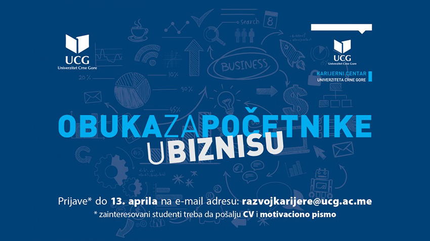 Kancelarija za razvoj karijere i cjeloživotno učenje Univerziteta Crne Gore (UCG) organizuje besplatnu obuku za početnike u biznisu, namijenjenu studentima svih nivoa studija.