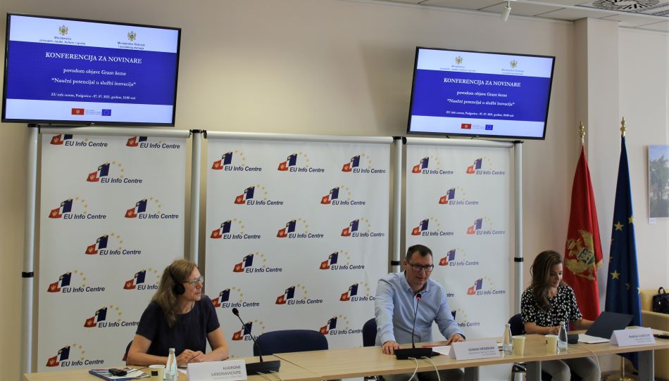 Danas je, u prostorijama EU info centra, odžana konferencija za medije povodom objave grant šeme „Naučni potencijal u službi inovacija“. Ovom prilkom predstavnicima medija obratili su se se: v.d. generalnog direktora Direktorata za evropske integracije, programiranje i implementaciju EU fondova i međunarodnu saradnju u Ministarstvu prosvjete nauke, kulture i sporta Goran Drobnjak, zamjenica šefa sektora za saradnju – Delegacija EU u Crnoj Gori Audrone Urbonaviciute, te generalna direktorica Direktorata za finansiranje i ugovaranje sredstva EU pomoći u Ministarstvu finansija i socijalnog staranja Marija Vukčević.