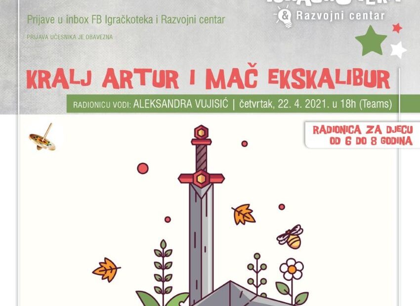 Igračkoteka i Razvojni centar Udruženja Roditelji i Čigralište organizuju u četvrtak, 22. aprila, u 18 sati, čitalačku onlajn radionicu Kralj Artur i mač Ekskalibur, u toku koje će mališani komunicirati na maternjem i na engleskom jeziku.