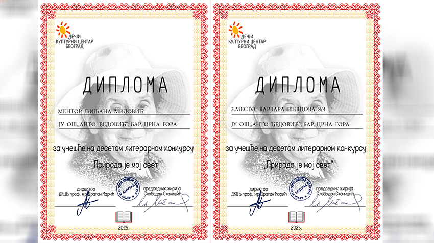 Učenica VIII-4 OŠ „Anto Đedović“ u Baru Varvara Ševcova osvojila je treće mjesto na međunarodnom literarnom takmičenju „Priroda je moj svet“, posvećenom pjesnikinji Desanki Maksimović, u kategoriji poezije. Ona se takmičila stihovima „Jedno jutro proljeća“, a inspiraciju je našla u ljepoti Žabljaka gdje u porodičnom okruženju provodi ljetnji rasput. Varvarina mentorka je profesorica Ljiljana Milović.