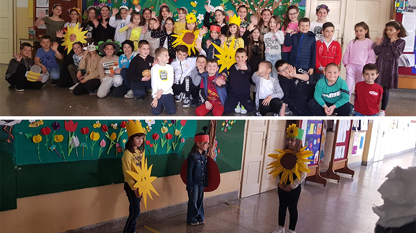 Djeca su tom prilikom pravila vjesnike proljeća od krep papira i papira u boji i istim ukrasili pano škole.