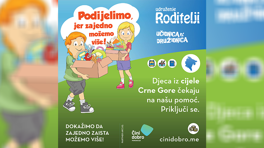 Kako je istaknuto, partner udruženju Roditelji u realizaciji humanitatne akcije biće i ove godine Fondacija Čini dobro, koja će donirati novac za kupovinu školskog pribora za školarce, ali i pomoći u prikupljanju donacija aktiviranjem online platforme putem koje svi zainteresovani, bez obzira da li žive u Crnoj Gori ili inostranstvu, mogu donirati u samo nekoliko klikova na linku https://cinidobro.me/product/podijelimo-jer-zajedno-mozemo-vise/