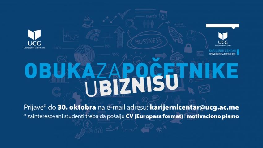Univerzitet Crne Gore (UCG) pozvao je student da se prijave za besplatnu dvomjesečnu obuku za početnike u biznisu do 30. oktobra. Obuka je zbog epidemiološke situacije i važećih mjera iz prethodnog pomjerena za ovaj studijski semestar, za novembar i decembar.