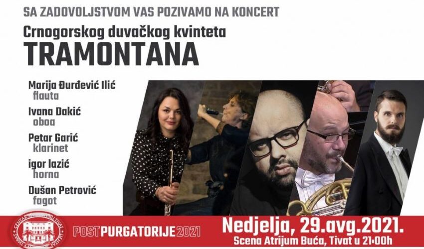Koncert Crnogorskog Duvačkog kvinteta Tramontana održaće se 29. avgusta u Atriumu Buća u Tivatu. Kvintet je osnovan ove godine u saradnji sa kolegama, vođama duvačkih sekcija iz Srbije i Makedonije,…