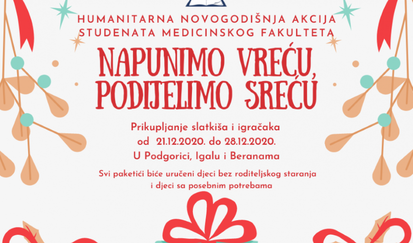 Studenti Medicinskog fakulteta Univerziteta Crne Gore pozvali su studente i građane da daju svoj doprinos humanitarnoj novogodišnjoj akciji „Napunimo vreću, podijelimo sreću“, saopštili su iz te ustanove. Zainteresovani će imati…