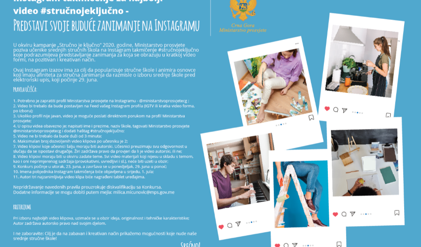 U okviru kampanje #StrucnoJeKlucno 2020. godine, Ministarstvo prosvjete poziva učenike srednjih stručnih škola na Instagram takmičenje #StručnoJeKljučno, koje podrazumijeva kreativno predstavljanje zanimanja za koja se obrazuju, i to u kratkoj…