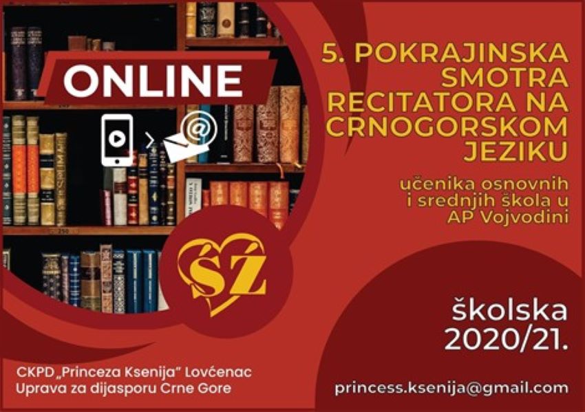 Pokrajinska smotra recitatora na crnogorskom jeziku za školsku 2020/21. godinu održaće se onlajn za učenike osnovnih i srednjih škola sa teritorije Vojvodine, saopštilo je Crnogorsko kulturno prosvjetno društvo (CKPD) „Princeza Ksenija“ iz Lovćenca.