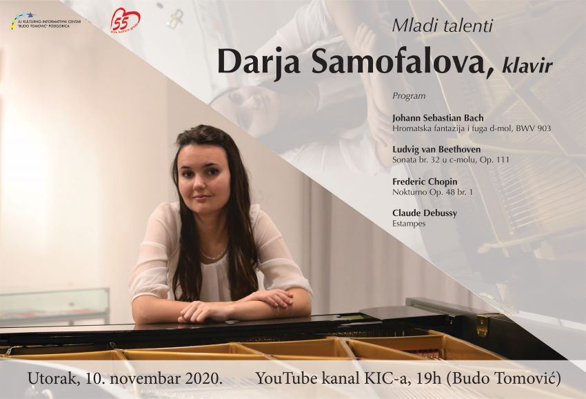 Mlada pijanistkinja Darja Samofalova prirediće online solistički koncert koji će biti emitovan u okviru KIC-ovog koncertnog ciklusa „Mladi talenti“, na YouTube kanalu KIC-a „Budo Tomović“, u utorak, 10. novembra, u 19 sati.