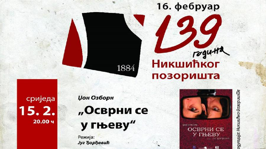 Predstava „Osvrni se u gnjevu“ nastala je po tekstu Džona Ozborna, u režiji Juga Đorđevića. Uloge su povjerene: Jovanu Krivokapiću, Maji Stojanović, Nikoli Vasiljeviću, Gordani Mićunović i Bobanu Čvoroviću. Dramaturgiju potpisuje Tijana Grumić, scenografiju Andrea Rondović, kostime Velimirka Damjanović, a muziku Julija Đorđević.