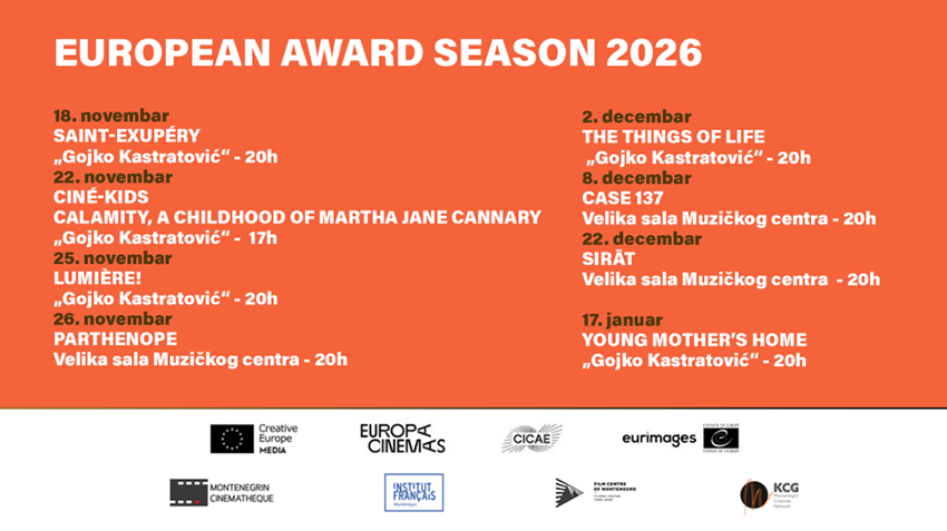 Crnogorska kinoteka, u saradnji sa Evropskom filmskom akademijom (EFA), uz podršku programa MEDIA Kreativna Evropa, Filmskog centra Crne Gore i brojnih drugih partnera, predstavlja jedinstvenu manifestaciju posvećenu raznolikosti, kvalitetu i bogatstvu evropske kinematografije – European Award Season 2026.