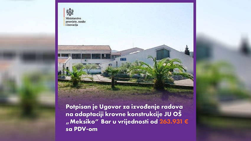 Potpisan je Ugovor za izvođenje radova na adaptaciji krovne konstrukcije OŠ ,,Meksiko“ u Baru u vrijednosti od 263.931 eurO sa PDV-om. Novac za radove obezbijeđen je iz budžeta, a adaptacija će, zbog organizacije nastavnog procesa i bezbjednosti učenika početi u junu, po završetku nastavne godine, saopšteno je iz Ministarstva prosvjete, nauke i inovacija.