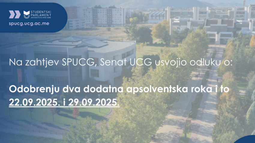 Senat Univerziteta Crne Gore (UCG) razmatrajući zahtjev Studentskog parlamenta, odobrio je dodatne ispitne rokove studentima završne godine osnovnih, postdiplomskih specijalističkih i dvogodišnjih master studija, kojima je do završetka studija ostao nepoložen i/ili neprijavljen samo jedan ispit, nakon čega mogu braniti završni, specijalistički, odnosno master rad.
