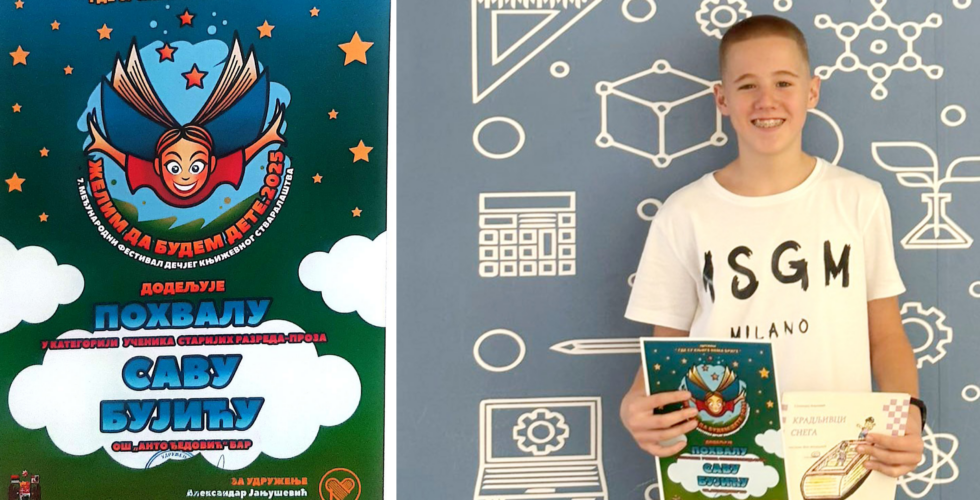 Učenik VII-3 odjeljenja OŠ „Anto Đedović“ iz Bara Savo Bujić osvojio je pohvalu na ovogodišnjem, sedmom po redu, međunarodnom konkursu u okviru festivala dječjeg književnog stvaralaštava „Želim da budem dete“.…