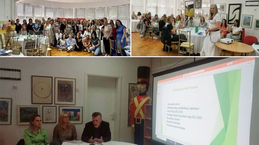 Predstavnici Zavoda za školstvo Fran Vuljaj, Ermina Alomerović i Nataša Golubović upoznali su učesnike sa inoviranim Programom za predškolsko vaspitanje i obrazovanje. Naime, jedan od ciljeva ove obuke je da se kroz uporednu analizu važećih programa i inoviranog Programa za predškolsko vaspitanje i obrazovanje prepoznaju prednosti i značaj novina u daljem radu i inoviranju prakse.
