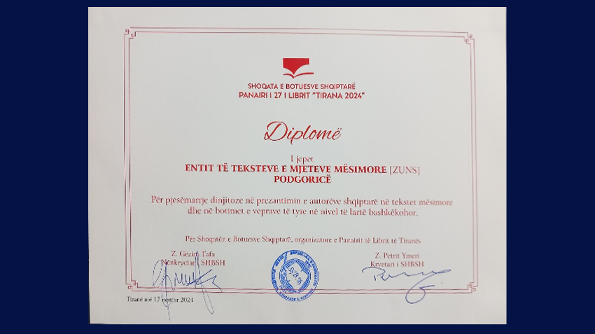 Na upravo završenom 27. Međunarodnom sajmu knjiga u Tirani, Zavod za udžbenike i nastavna sredstva – Podgorica nagrađen je vrijednim priznanjem. Nagrada Zavodu dodijeljena je za izuzetno kvalitetno predstavljanje albanskih autora u udžbenicima i publikacijama koje objavljuje ova izdavačka kuća.